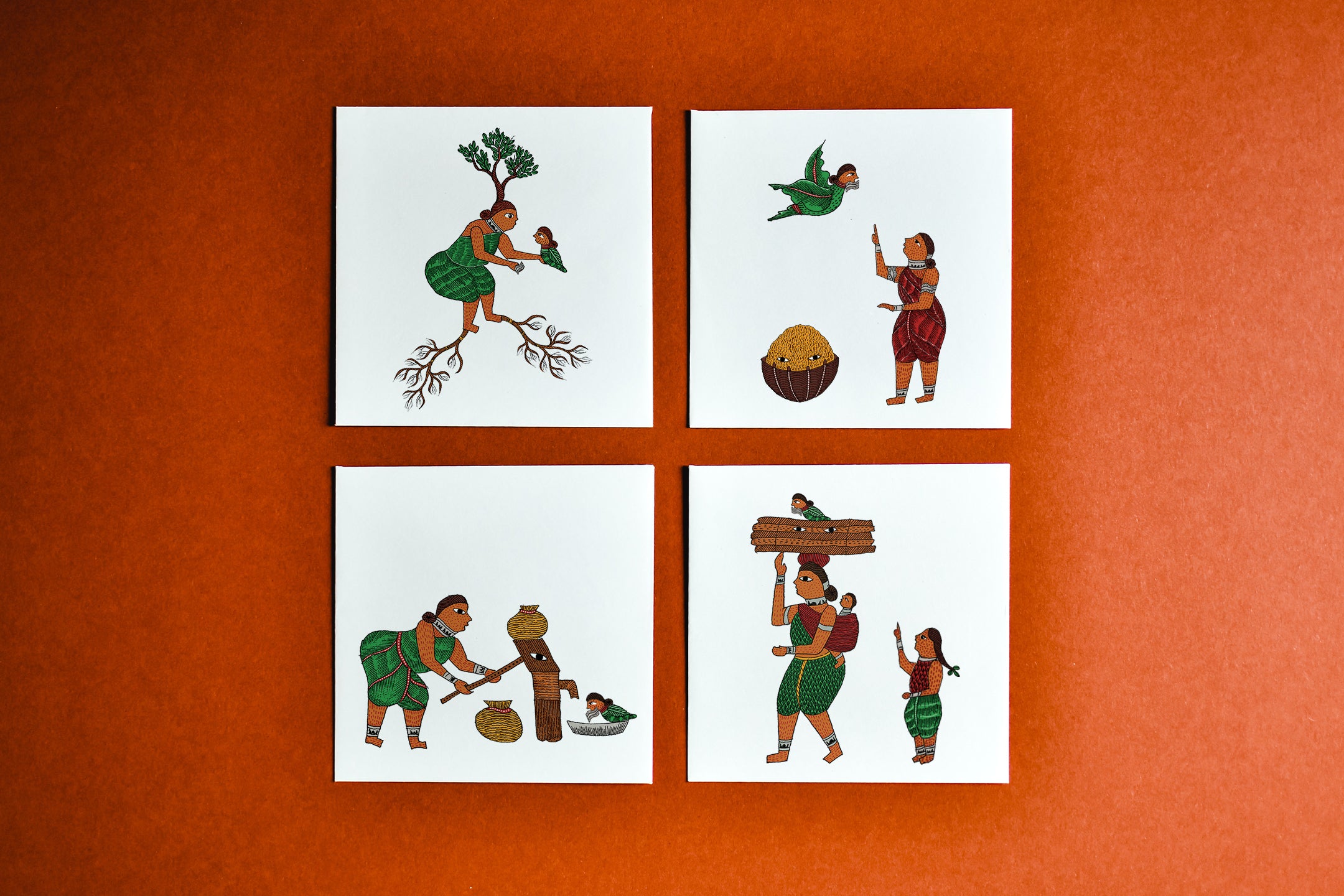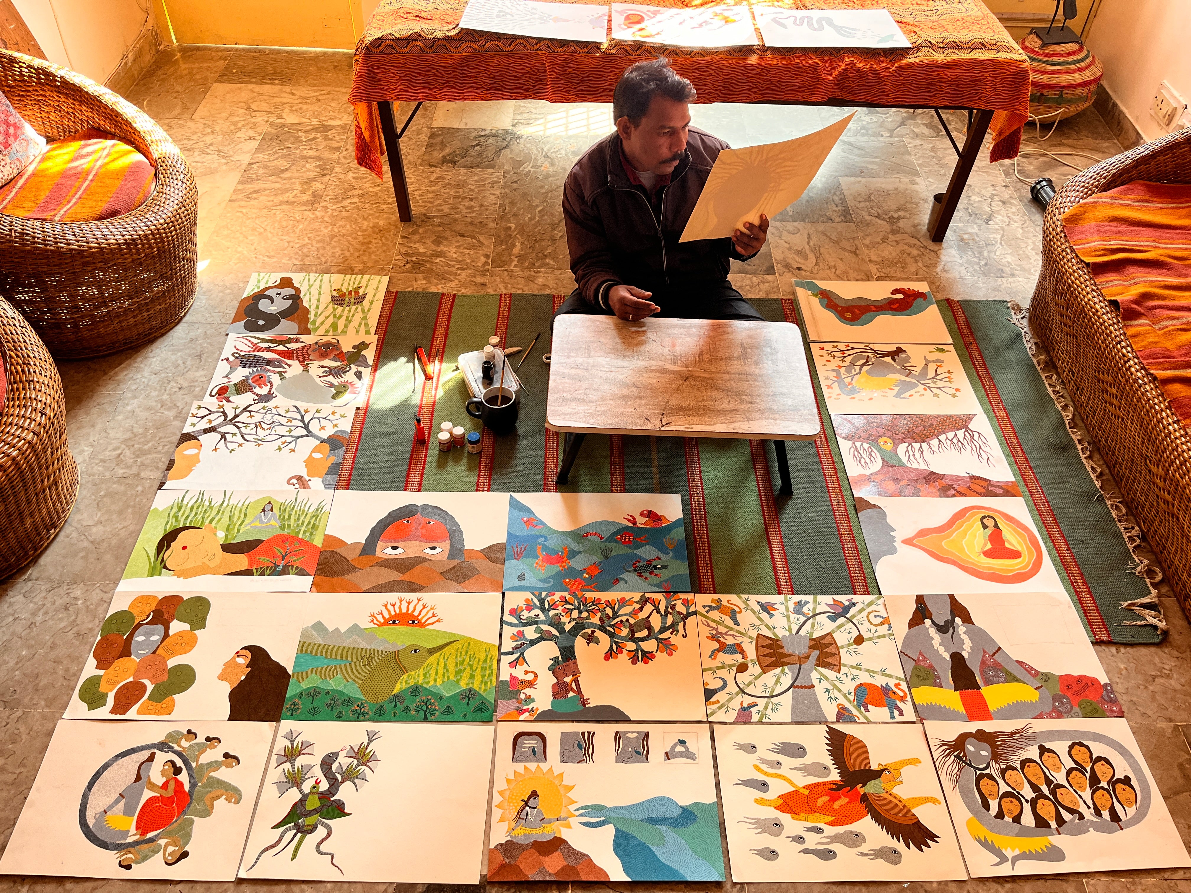 Crafted entirely in-house, we collaborate closely with artists from indigenous communities to meticulously visualize oral narratives, traditionally passed down by knowledge keepers of tribal Madhya Pradesh.
